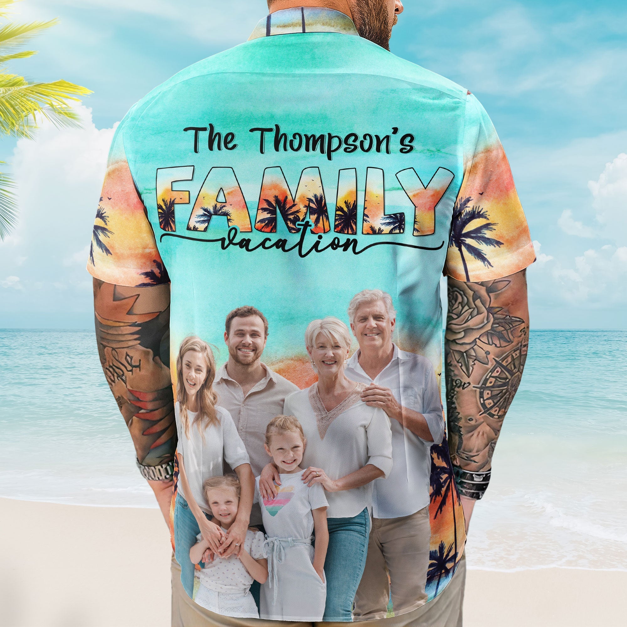 This Hawaiian shirt is not just a regular shirt. It’s a special one that you can customize with your own family name. You can choose any name that you and your family members go by, such as your last name, your first names, or your nicknames. You can also custom family photo on the back, and photo of each member on the front. This personalized Hawaiian shirt has a tropical print that makes it as personal and unique as you want.