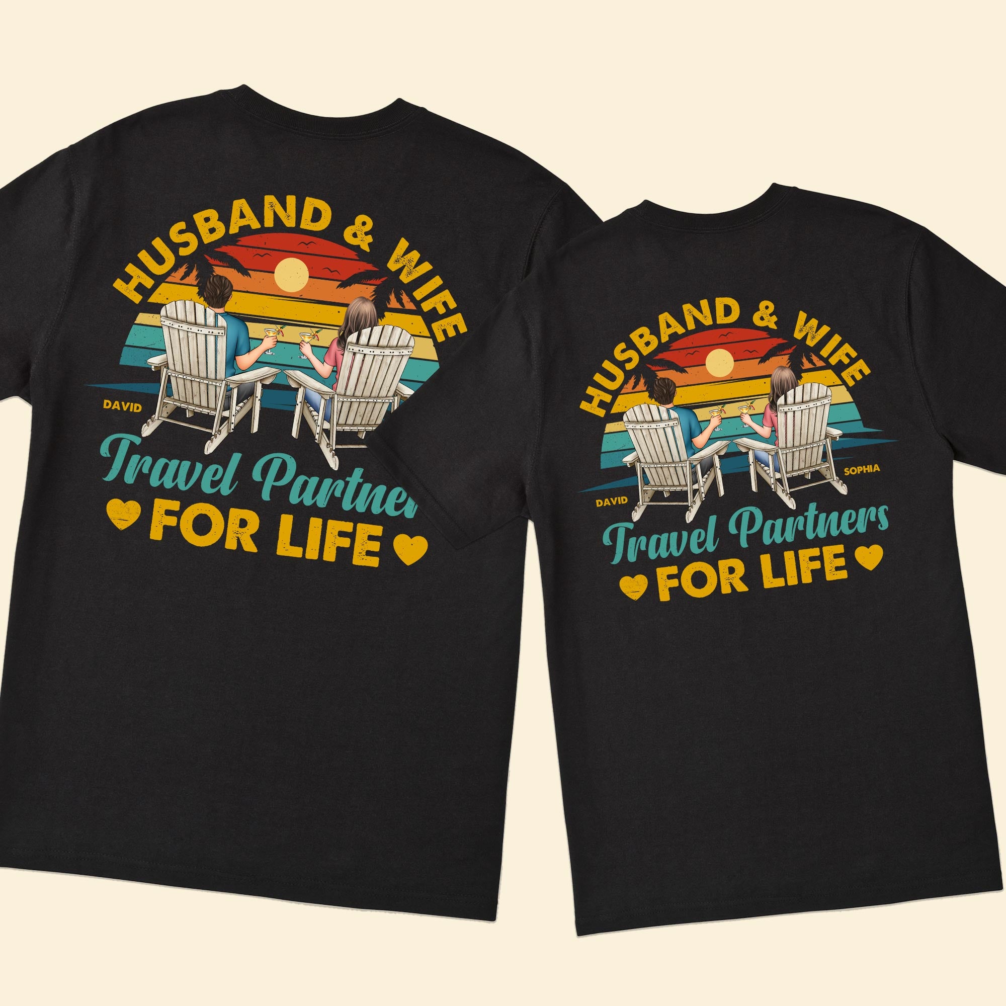 Celebrate your love and adventure with our Personalized Back Printed Shirt, perfect for couples who are “Husband & Wife, Travel Partners For Life.” These matching shirts, featuring custom characters that resemble you and your partner, are designed with a romantic beach theme. Whether you’re planning a honeymoon, anniversary trip, or a summer getaway, these shirts are a delightful way to showcase your bond.